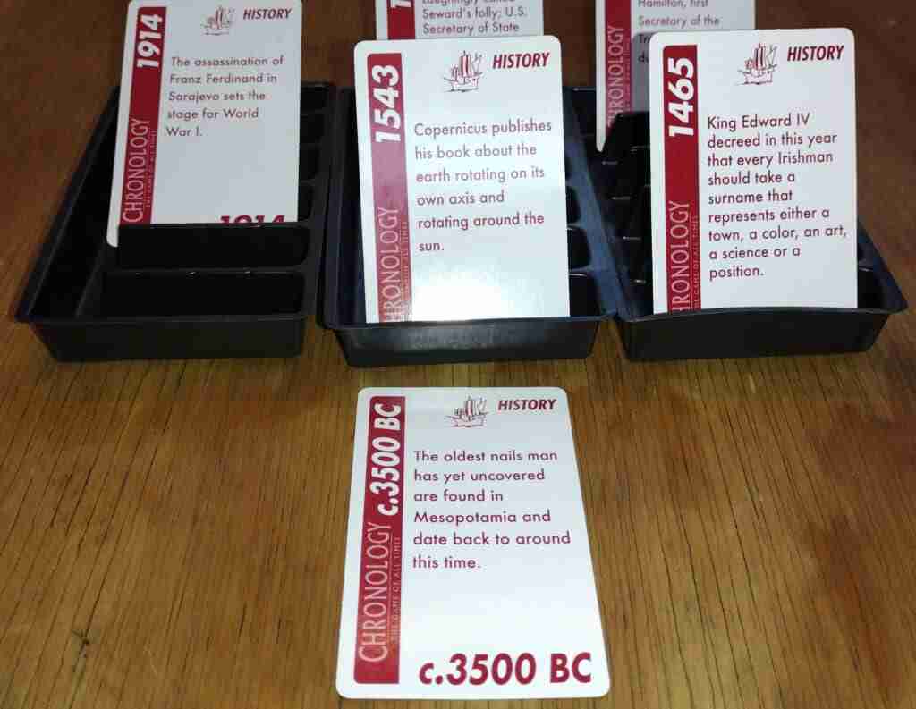 Chronology comes with 6 trays for up to 6 players, but there’s no real reason more couldn’t play. There are plenty of cards for 4 different categories: history, arts & entertainment, inventions & discoveries, and sports. One thing that does make Chronology easier is that everyone makes their own timeline, and you only go up to 5 cards in a timeline.