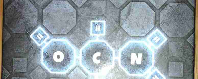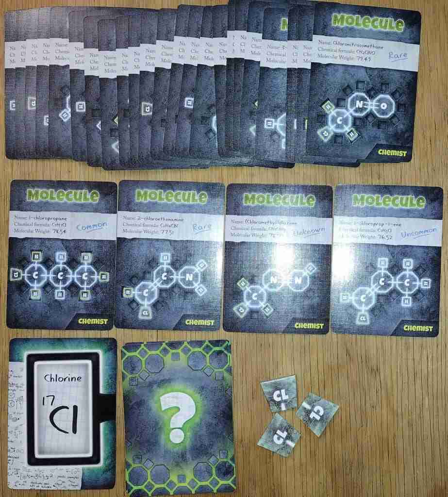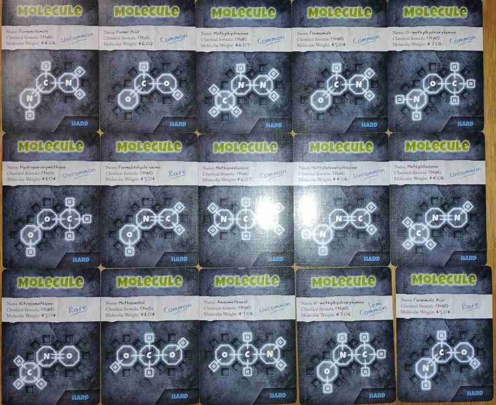 There are three different levels of chemical formulas. Every molecule has 3 octagon-shaped tiles (carbon, nitrogen, or oxygen). There are 11 easy cards that each have at least 2 carbons, 15 hard cards that each have 1 carbon, and 27 chemist cards. Easy cards have between 4-8 hydrogens. Chemist cards add in chlorine. So far, we have only played with the Easy cards, and they have provided plenty of challenge for us.