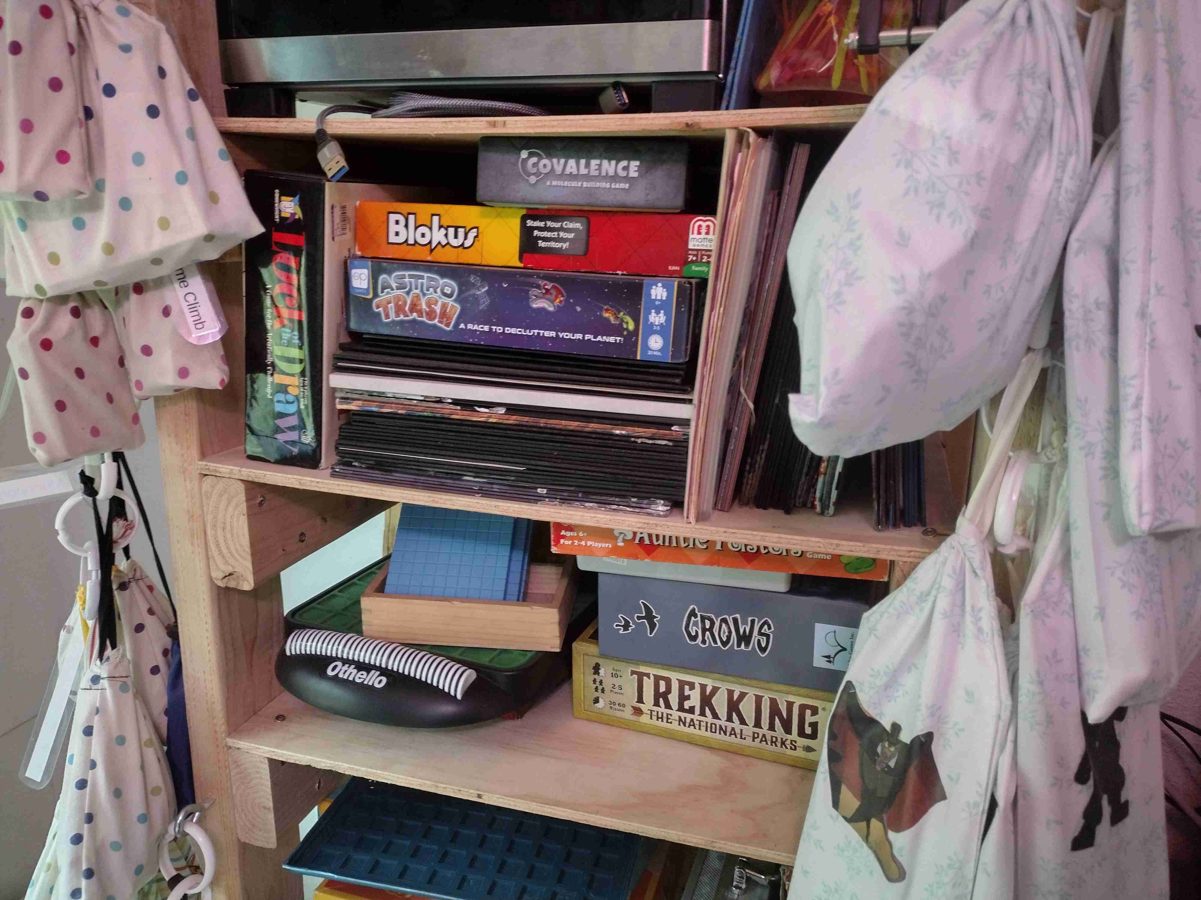 So I made bags out of old sheets. My sewing skills are pretty basic, but they’re robust enough to sew a bag with a drawstring. I use ribbon for the drawstring (I was gifted a ton of satin ribbon years ago, and am still working my way through it!), and then hang them using shower curtain rings. Since I’m making the bags, I’m able to make them exactly the size needed for the game, which helps to save a bit of space. Game boards are stored in a separate stack.