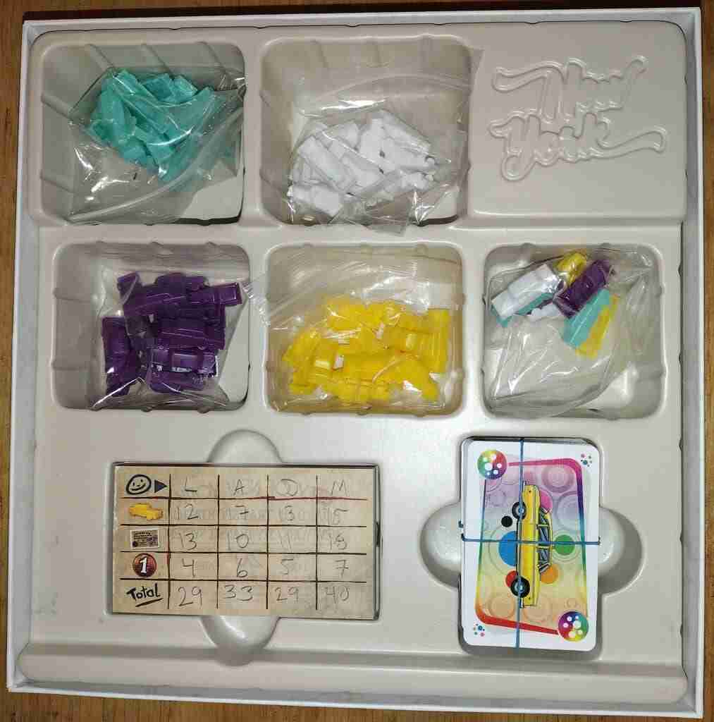 Depending on which version you are playing, the board may be very large, or quite small. The original (USA) board is large; nearly 2’x4′, but the New York board (and box) are significantly smaller. There are also trains of different colors, ticket cards, and train cards.