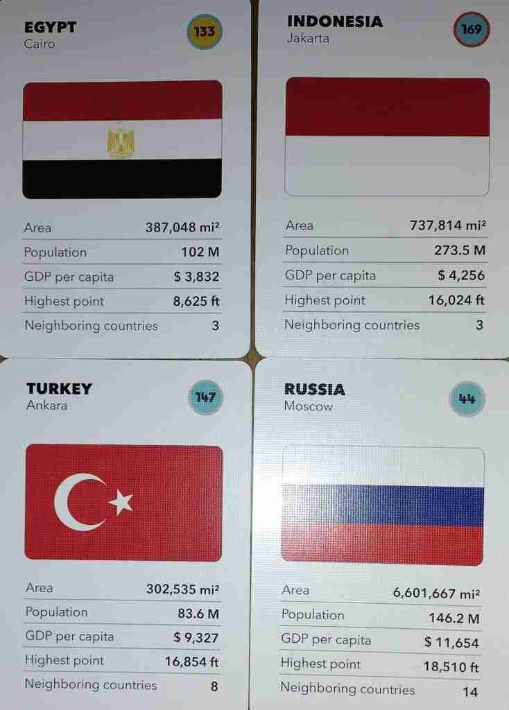 The World Geography Card Game came out first in 2018 (and was updated in 2019 before we bought our copy), but the board game came out in 2020. Both games include all 193 countries recognized by the European Union plus Vatican City as a UN observer.